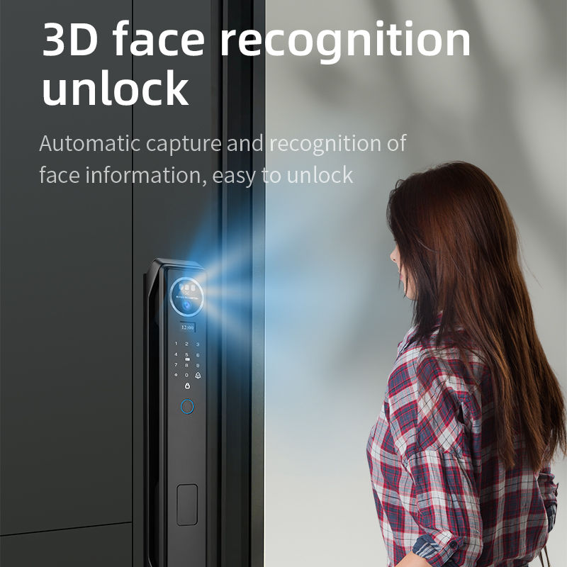 ◊ Metodi di sblocco multipli – Supporta impronta digitale, riconoscimento 3D del volto, riconoscimento del palmo, password, scheda IC, chiave meccanica e controllo remoto tramite l'app Tuya.